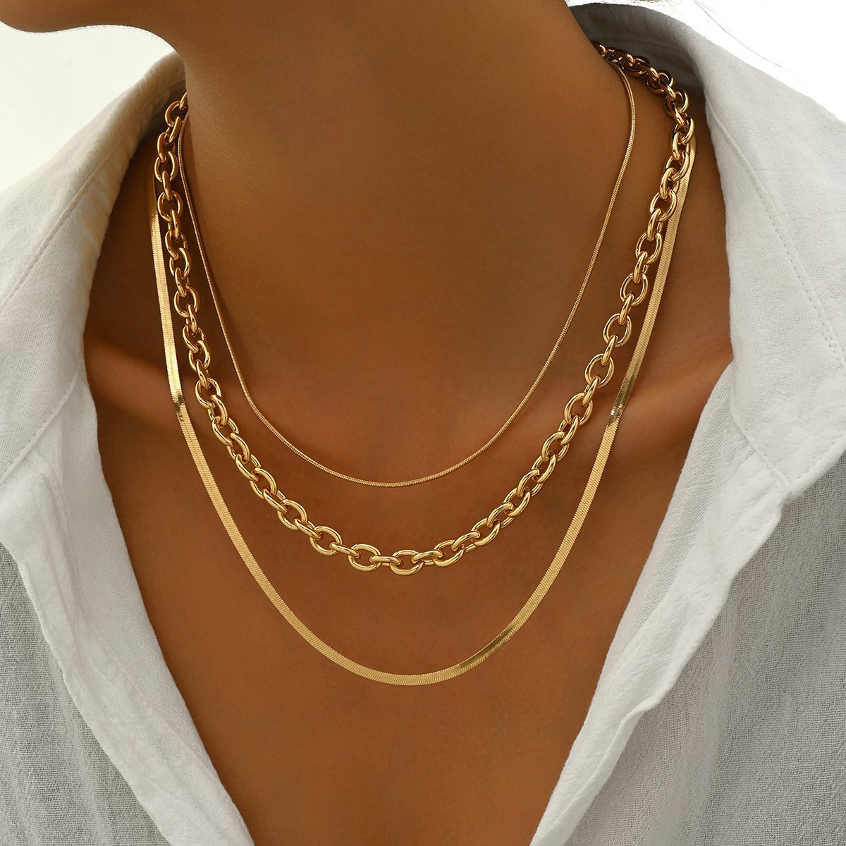 This three-layer gold chain necklace set is a must-have fashion accessory for women. Whether it is daily wear or special occasions, this necklace set can add a touch of highlights to your look. Made of high-quality gold chain, each layer has different textures and widths, creating a layered effect.